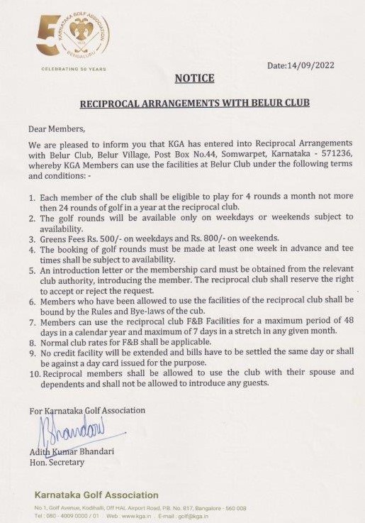 RECIPROCAL ARRANGEMENTS WITH BELUR CLUB
